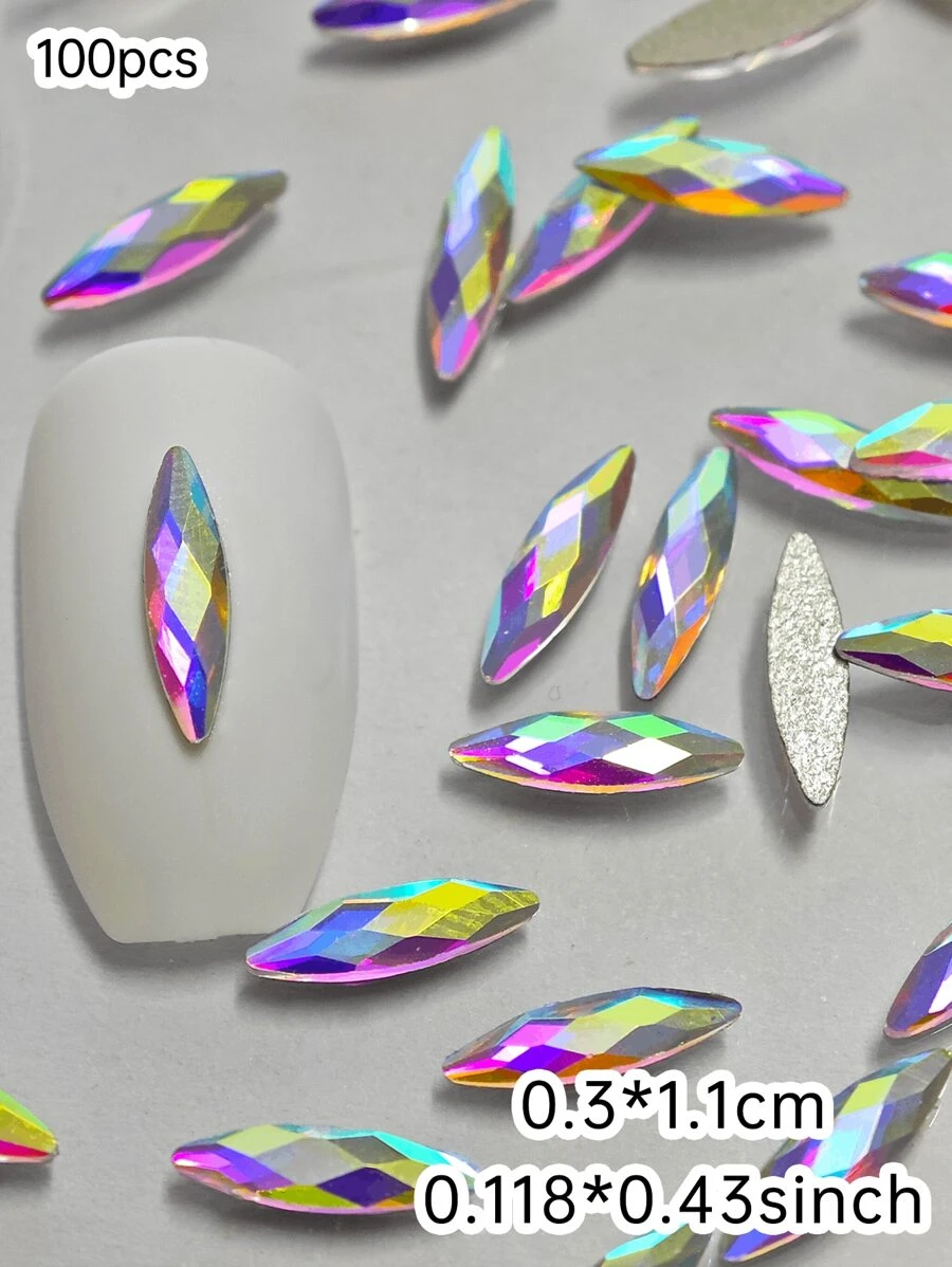 100Pcs Nail Gems AB Color, Marquise Shape, Flat Back Nail Art Diamonds, Glass Material, 3*11mm, Shiny Crystal Color Nail Supplies, Nail Art Accessories, Suitable For Nail Salons Or Holiday DIY Parts