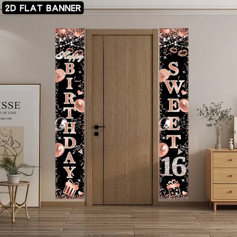 2pcs 2D Flat Sweet 16 Birthday Door Hanging Banner, Rose Gold Polyester Happy Birthday Sign, No Power Needed, Suitable For Girls 16th Birthday Party Decor And Photo Props, Shiny Birthday Banner Crafted