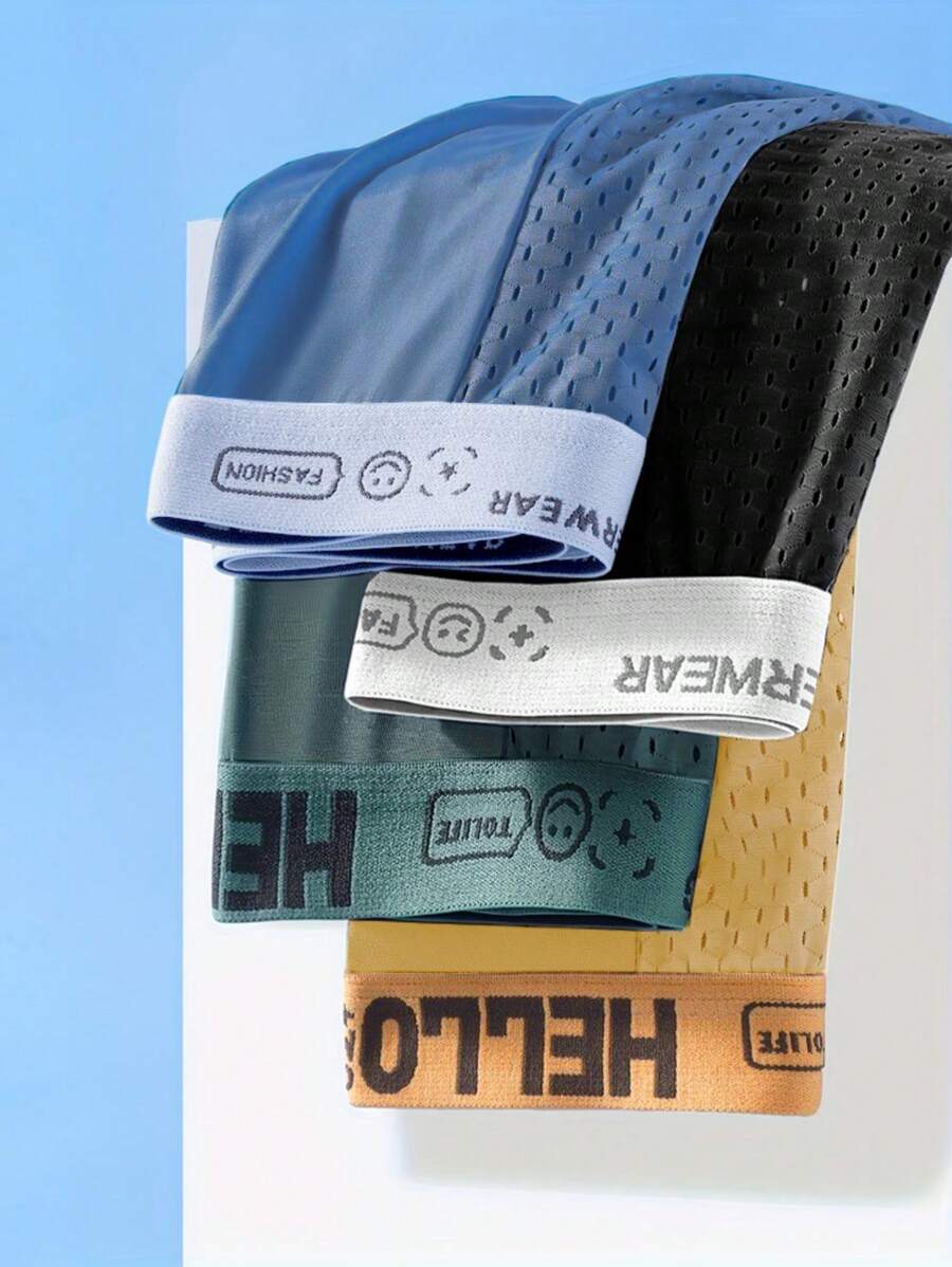 4pcs Pack Men's "Hello" Fashion Mesh Breathable Comfortable Letter Printed Boxer Briefs, Men's Loungewear Underwear