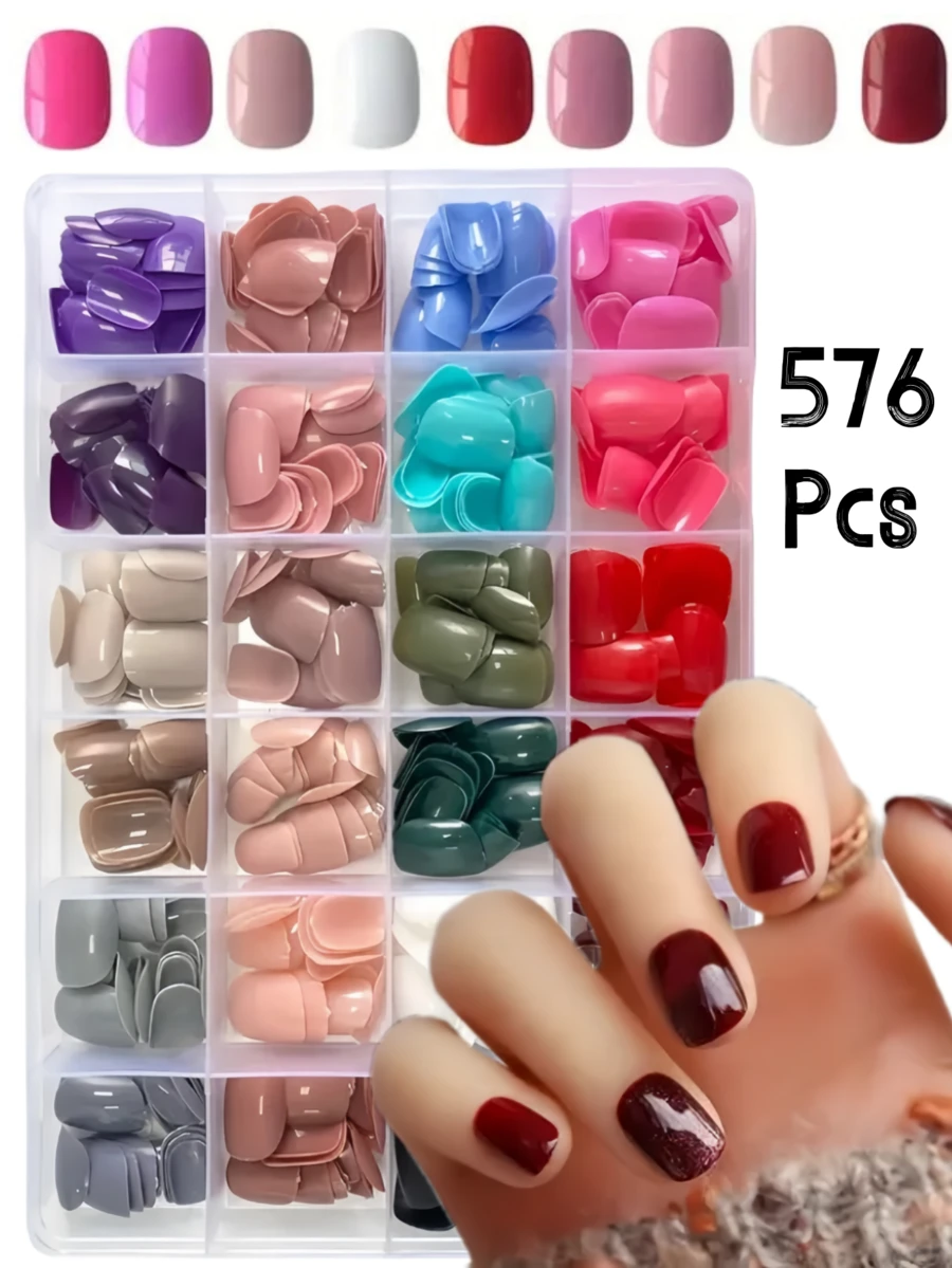576pcs Short Square Press-On Nail Stickers, 24 Colors Soft Gel Nail Strips, Suitable For DIY Fake Nails, Minimalist & Versatile, 15 Sizes, For Women Nail Supplies