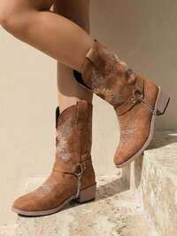 Planare Women's Brown Embroidered Floral Sunflower Removable Waist Chain Decor Western Boots, Cowboy Boots, Mid-Calf Boots, Boots, Block Square Low Heel Slip-On Booties, Versatile For Casual, Holiday, Party, Music Festival, Punk Retro Outfits, Autumn/Winter #9 Bestseller