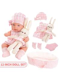 12-Inch Baby Doll With Accessories Doll Set, Includes 12-Inch Baby Doll, Pink Plaid Rabbit Dress, Hat, Cradle, Socks, And Baby Plush,Baby Doll,Baby Doll Accessories,Doll,Baby Doll,Baby Doll Accessories,Doll