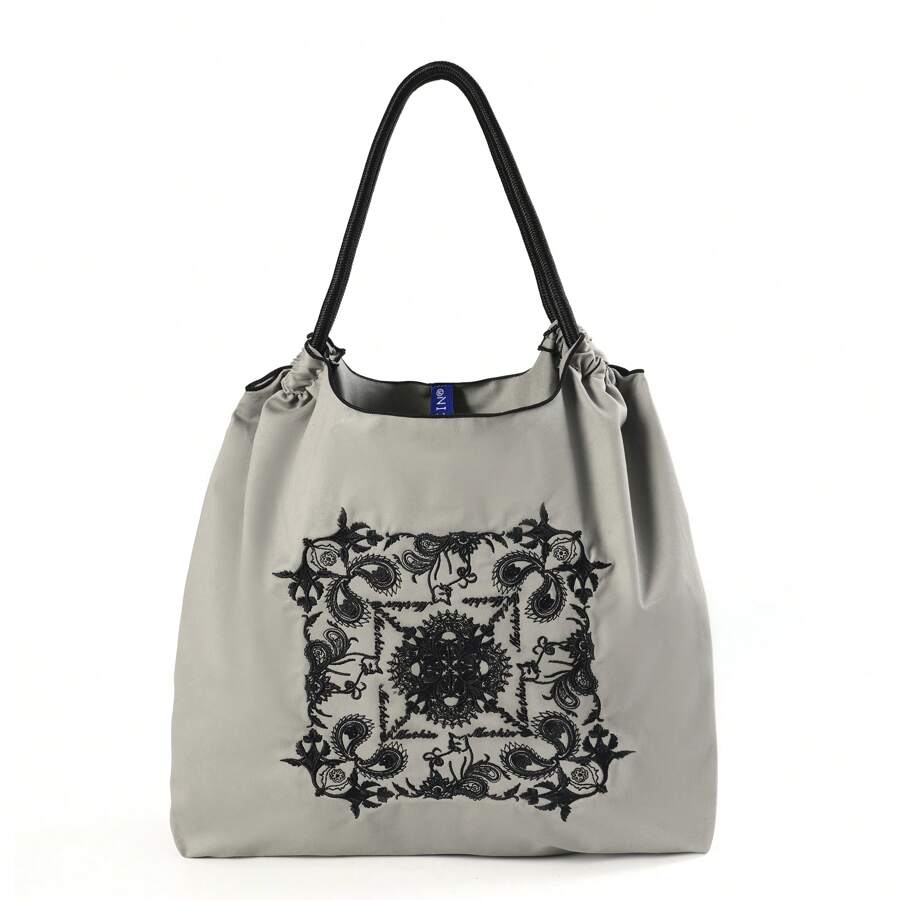 MZTKIN New Casual Elegant Embroidered Dark Gray Mandala & Paisley Flower Pattern, Foldable Nylon Shopping Bag, Large Capacity Handbag Tote, Suitable For Commuting, Shopping, Beach Party