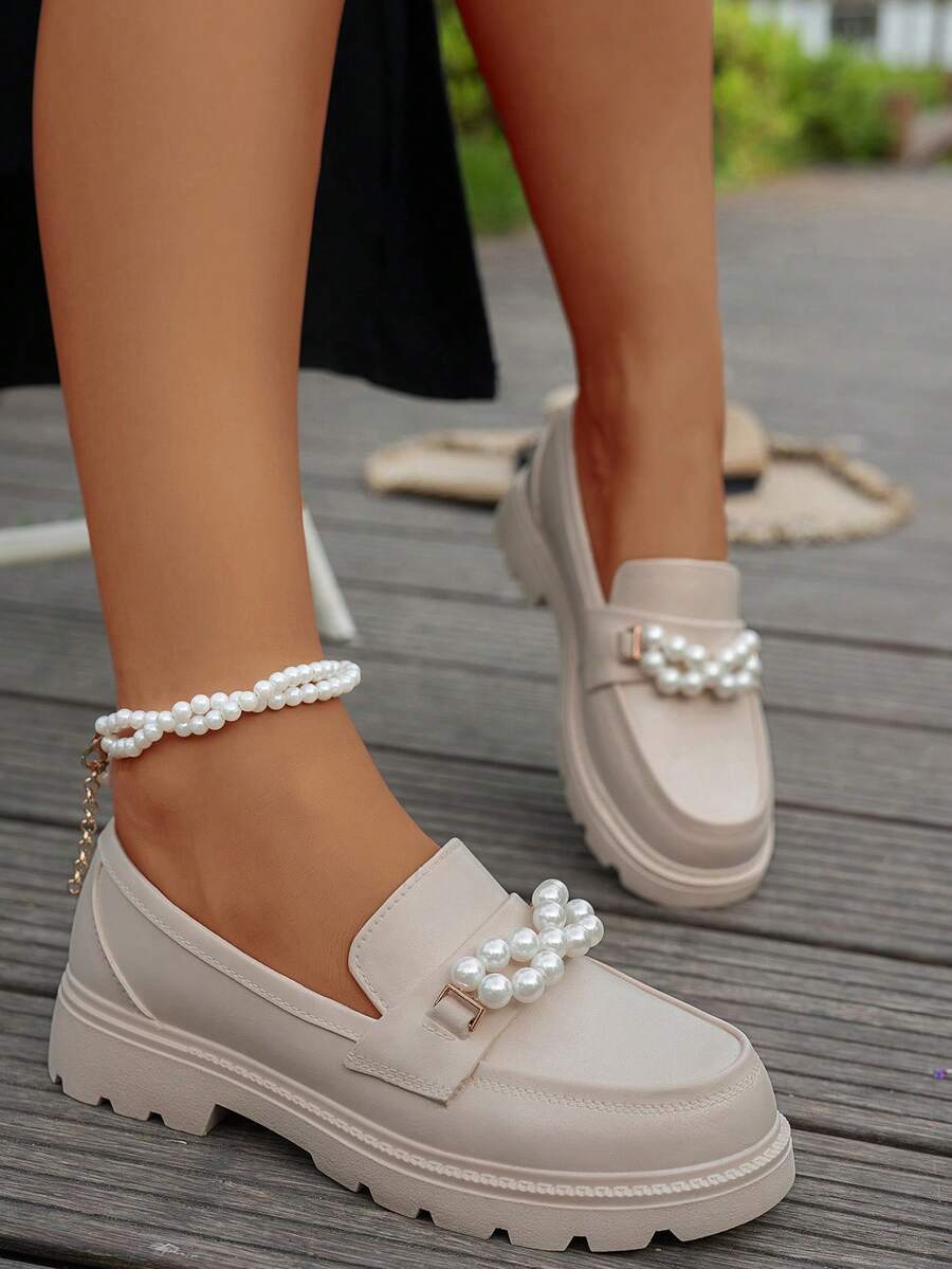 Women's Thick Sole Solid Color Loafers, Fashionable College Style Metal Pearl Loafers, Comfortable And Lightweight Shoes Black Retro French Thick Sole Mary Jane Shoes For Women, New Style Suitable For Dresses, Low Vamp Shoes