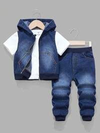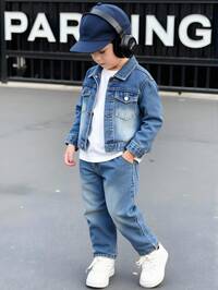 Playful PalsSHEIN Playful Pals 2pcs Young Boys Denim Jeans Set, New Arrival For Autumn/Winter, Medium Blue Denim Color, Casual Collegiate Style, Distressed Ripped Design, Slim Fit, Denim Jacket Outerwear, Stretchy & Soft Fabric, Comfortable, Suitable Foraily Wear, School, Commuting Denim Boys Outfit Trending Boy Clothes Boy Blue Outfit