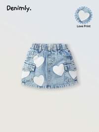 Baby Girls Casual Denim Heart Print Patch Pocket Elastic Waist Skirt