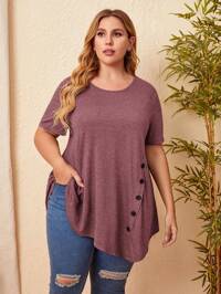 INAWLY Plus Size Women Solid Color Simple Round Neck Split T-Shirt For Daily Wear