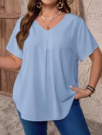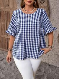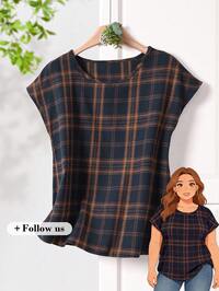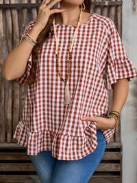 EMERY ROSE CURVEEMERY ROSE Plus Size Women's Spring/Summer Casual Vacation Country Style Plaid Round Neck Short Sleeve Blouse, Spring/Summer,Early Spring,Spring Break Outfits ,Vacation Outfits Women ,Holiday Outfits For Women,Spring Clothes Women,Going Out Outfits,2026 New Clothes,Simple And Fashionable For Everyday Wear, Plaid Top, Checkered Top