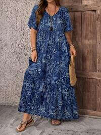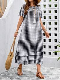 EMERY ROSE Plus Size Women Plaid Round Neck Short Sleeve Casual Loose Dress For Summer, Women's Summer Clothing, Women's Beach Wear, Vacation Wear, Country Concert Wear, Carnival Wear, Beach Vacation Wear,Office Outfits For Women,Work Dresses For Women, Business Casual Woman,Tea Party Dress,Dresses Casual Gingham Dress Black And White Gingham Dress Flowy Dress,Spring #2 Bestseller