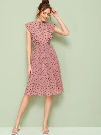 SHEIN Tie Neck Ruffle Trim Pleated Dress