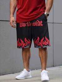 ResortEase Plus Size Men's Casual Letter & Flame Print Shorts, Summer , Flame Shorts , Graphic Shorts Black , Black Shorts Flames , Worldwide Shorts , Black Shorts With Flames