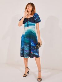 Tina Benally Art Graphic Print Puff Sleeve Knot Front Dress