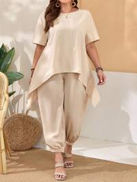 SHEIN CURVE+ Plus Size Women'S Short Sleeve Asymmetrical Hem Top And Bloomers Boho Khaki Two-Piece For Spring